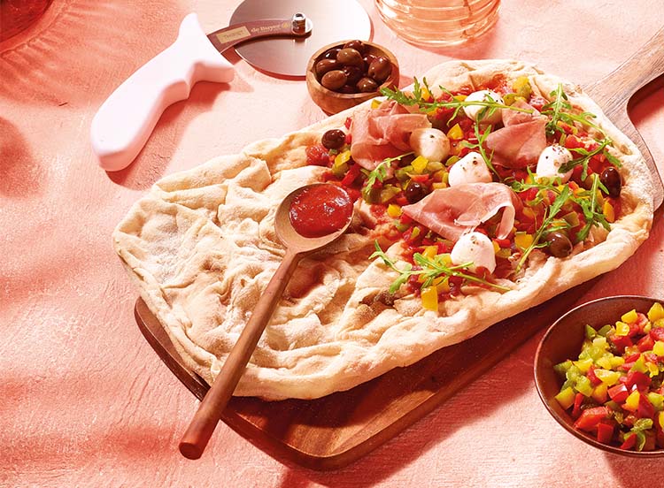 Vous pouvez également garnir votre pinsa avant de la mettre au four, dans ce cas, laissez cuire 6 à 8 minutes.