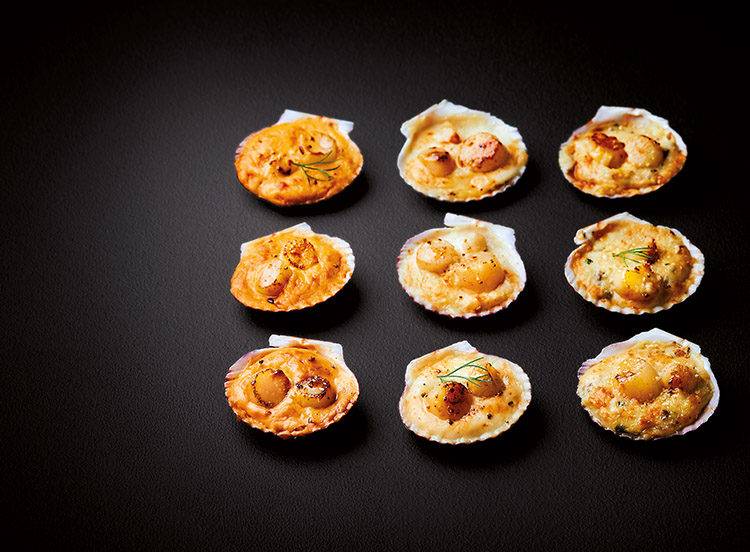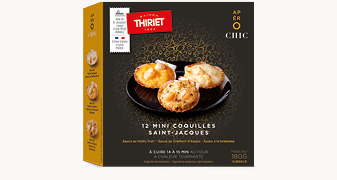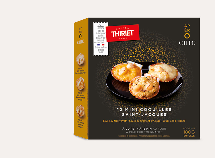 Noix de Saint-Jacques* (mollusques) 35%, crème fraîche (lait) (origine France) 12,9%, fumet de poisson (eau, poisson (poisson), vin blanc (sulfites), carotte, céleri (céleri), oignon, poireau, beurre (lait)), jus de cuisson des champignons (eau, vin blanc (sulfites), jus de citron, sel), beurre (lait), Vermouth Noilly Prat® (sulfites, lait) 3%, bouillon de légumes (eau, céleri (céleri), tomate, carotte, champignon de Paris (sulfites), poireau, baie de genièvre), fumet de poisson et de barbes de Saint-Jacques (eau, barbe de Saint-Jacques (mollusques), vin blanc (sulfites), échalote, poisson (poisson), beurre (lait), carotte, céleri (céleri), oignon, poireau), farine de blé (gluten (Blé)), coulis de tomate (tomate, bouillon de légumes (eau, céleri (céleri), tomate, carotte, champignon de Paris (sulfites), poireau, baie de genièvre), concentré de tomate, champignons (sulfites), Porto rouge modifié (Porto (sulfites), sel), huile de tournesol, carotte, céleri (céleri), oignon, poireau, sel, poivre, nori), amidon, Crémant d'Alsace (sulfites) 1,7%, réduction d'oignon (oignon, vin blanc (sulfites), beurre (lait), ail), échalote, jus de moule (mollusques), beurre concentré (lait), champignon de Paris cuit (champignon de Paris (sulfites), beurre (lait)), lait écrémé en poudre (lait), chapelure (farine de blé (gluten (Blé)), sel), Muscadet (sulfites) 1%, jus d'huîtres (mollusques), emmental (lait), Vermouth modifié (Vermouth (sulfites), sel, arôme naturel), réduction d'échalotes (vin blanc (sulfites), échalote, beurre (lait), ail), sel, vin blanc (sulfites), Cognac modifié (Cognac (sulfites), sel, arôme naturel), persil, poivre, oignon (sulfites), ail (sulfites), curcuma