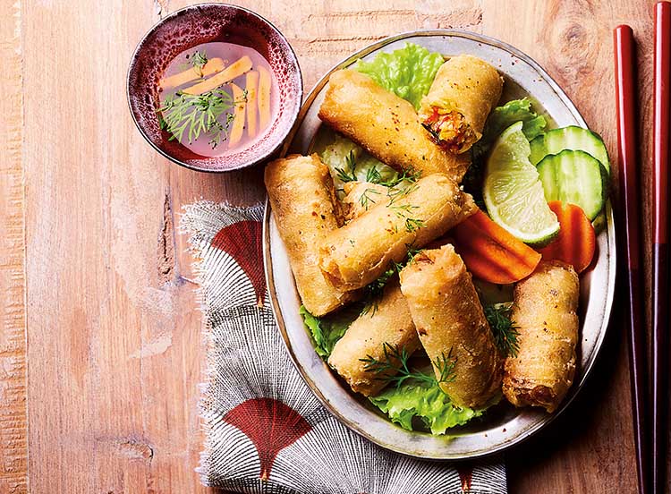 Mini nems, maxi délices ! Des galettes 100% farine de riz dorés à souhait et garnis d’une farce à base de crevettes, vermicelles de pois, carottes et champignons noirs, ils n’attendent qu’à être plongés dans leur sauce au nuoc-mâm… Invitez sans plus tarder le Viêtnam à votre table…