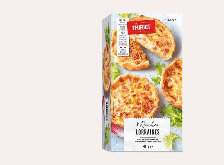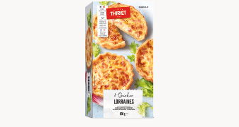 Eau, farine de blé (gluten (blé)) (origine France) 20,4%, œuf frais de poules élevées en plein air (oeufs)( origine france) 14,7%, lardon cuit fumé 13,1% (poitrine de porc (origine France) 12,5%, sel, arômes naturels*, antioxydant : acide ascorbique), jambon cuit supérieur 6,8% (jambon de porc (origine France) 6,3%, sel, bouillon de porc, arômes naturels*, antioxydant : acide ascorbique), huile de colza, crème fraîche (lait) 4,4%, fromage frais (lait), emmental (lait) 3%, fécule, lait écrémé en poudre (lait), amidon, farine de riz, poudres à lever : diphosphates - carbonate acide de sodium - amidon de blé (gluten (blé)), sel, poivre noir, muscade