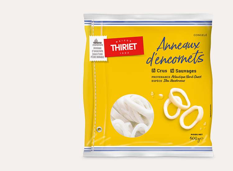 Dénomination de vente : Produit congelé. Anneaux d'encornets (ILLEX ILLECEBROSUS), pêchés aux chaluts en Atlantique Nord-Ouest