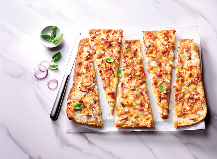 Crème fraîche légère (lait) 30%, farine de blé (gluten (blé)), lardon cuite fumé (poitrine de porc (origine France) 10%, sel, arômes naturels*, antioxydant : acide ascorbique), oignon grillé 11%, mozzarella 10% (lait (lait), sel, coaugulant microbien, ferment lactique (lait), correcteur d'acidité : acide citrique), eau, huile de tournesol, amidon, sucre, sel, levure, poivre blanc.