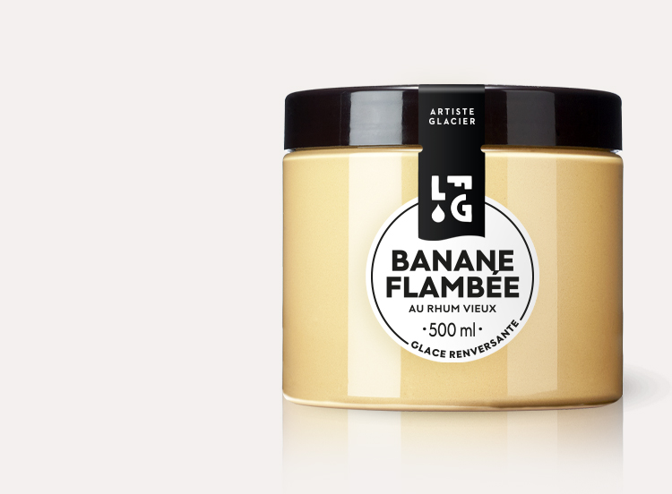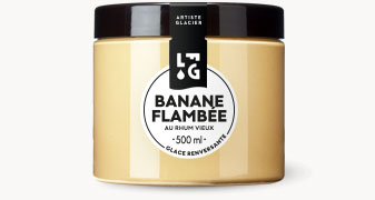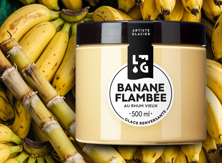 Dénomination de vente : Produit surgelé. Glace à la banane caramélisée et flambée au rhum vieux V.O martiniquais