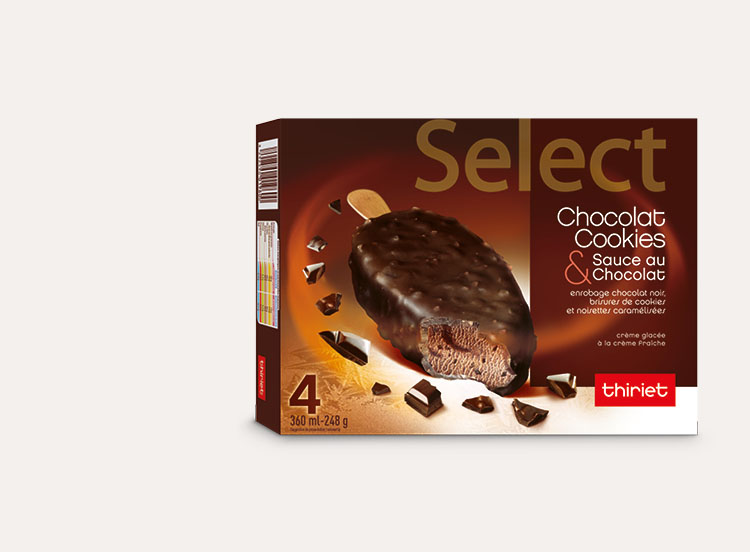 4 bâtonnets, de forme arrondie et gourmande, emballés individuellement.Crème glacée au chocolat, à la crème fraîche, avec des morceaux de cookies et une sauce au chocolat, enrobée de chocolat noir, pur beurre de cacao, avec des morceaux de cookies et de noisettes caramélisées.*Tous les ingrédients ne sont pas d'origine France