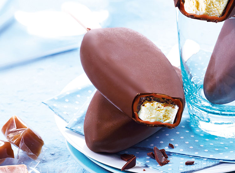 CRÈME GLACÉE VANILLE GOUSSE À LA CRÈME FRAÎCHE 41%, NAPPAGE AU CACAO 12%, SAUCE AU CARAMEL À LA CRÈME 19,5%, ENROBAGE CHOCOLAT AU LAIT 27.5%.