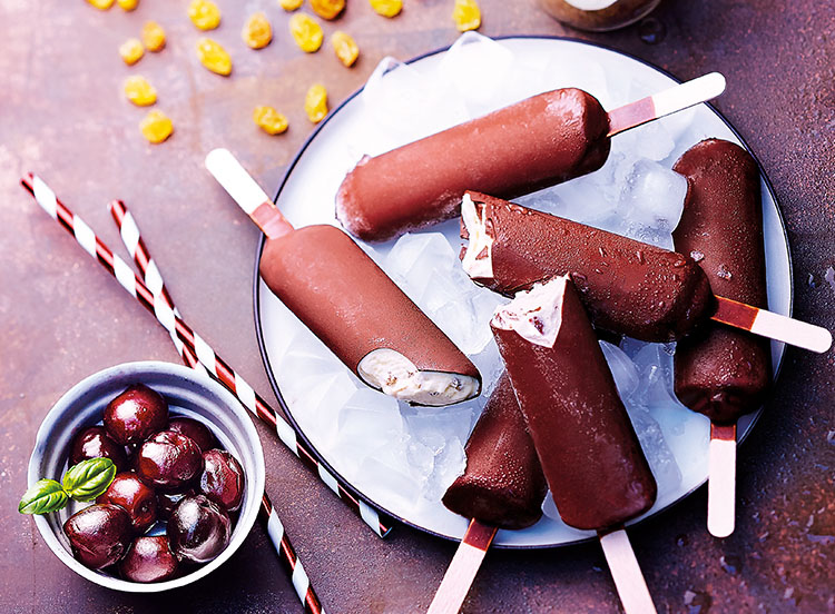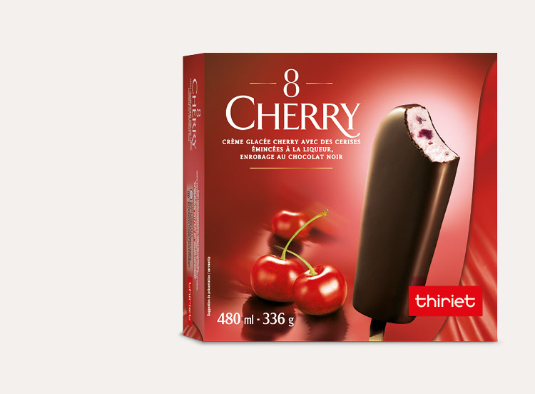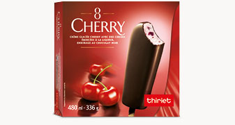 Une crème glacée cherry avec des cerises émincées à la liqueur, sous un enrobage au chocolat noir.