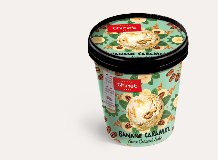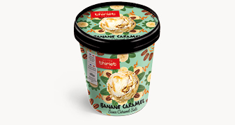 Une crème glacée banane caramel et une crème glacée vanille à la crème fraîche origine France riches en morceaux de noix de pécan caramélisées avec une généreuse sauce au caramel salé au sel de Guérande IGP**. Un pur moment de plaisir !