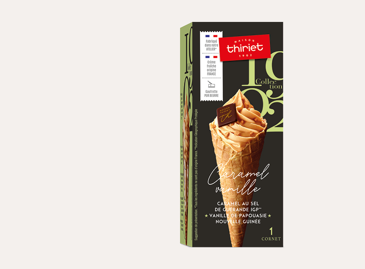 Découvrez une nouvelle génération de cornets ultra-gourmands élaborés dans notre Atelier Toqué* ! Un pur moment de gourmandise s'offre à vous du sommet jusqu'à la base du cornet. La dégustation commence par une crème glacée au caramel au sel de Guérande IGP** (crème fraîche origine France) surmontée d'amandes caramélisées. Elle se poursuit ensuite à l'intérieur de la gaufrette (pur beurre) qui renferme une crème glacée à la vanille de Papouasie-Nouvelle-Guinée (crème fraîche de Bresse AOP***) avec un cœur de sauce au caramel au sel de Guérande IGP**. Enfin, la dégustation se termine par un croustillant chocolat au lait du Ghana, praliné et billes de céréales. Une expérience gustative unique !
