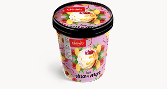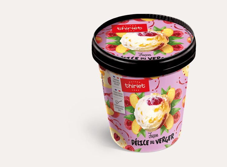 Inspirée du Délice du verger, célèbre pâtisserie de la maison Thiriet, cette délicieuse crème glacée au chocolat blanc et cubes de pêche à la crème fraîche origine France est agrémentée de morceaux de biscuit génoise et d'une compotée de pêche, avec une généreuse sauce à la framboise. Idéal pour une pause gourmande !*Tous les ingrédients ne sont pas d'origine France
