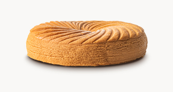 Notre coque en trompe-l'œil au chocolat blond Dulcey renferme bien des gourmandises ! Du feuilletage au bon beurre d'Echiré, enrobé de chocolat au lait Valrhona pour former la base de l’entremet. En guise de frangipane, une onctueuse glace amande grillée au lait frais des monts d’Ardèche. Et pour le côté régressif on termine avec une couche de caramel bien fondante.