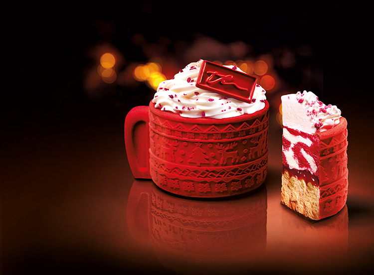 Un dessert glacé aussi surprenant que raffiné, présenté comme un mug original et coloré qui rappelle les moments cocooning au coin du feu, parfait pour vos tables festives.
