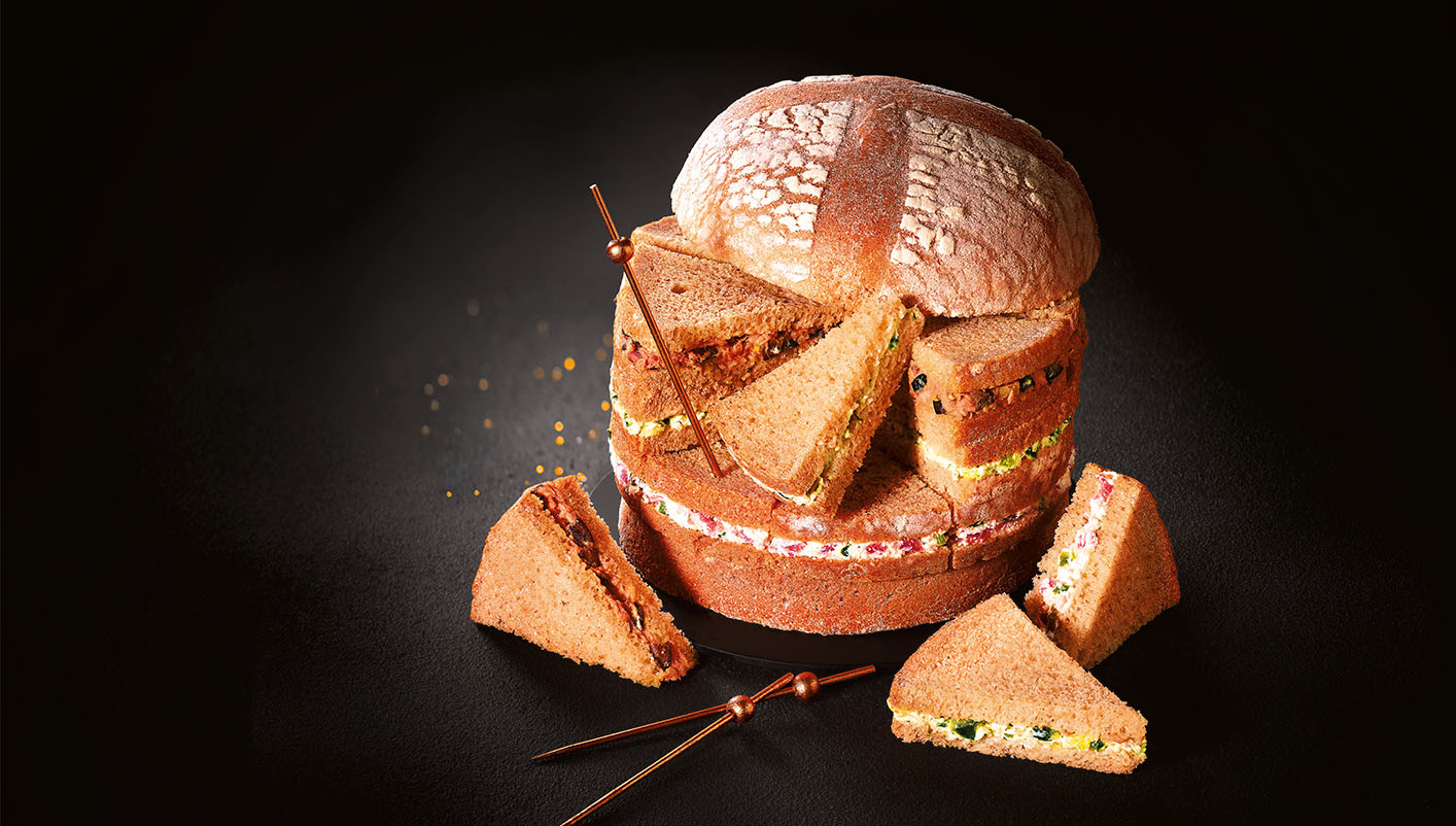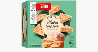 Dénomination de vente : Produit surgelé. Miche surprise 24 sandwichs à base de pain spécial : 8 sandwichs garnis de thon, olives noires et citrons confits ; 8 sandwichs garnis de fromage blanc, concombre et aneth ; 8 sandwichs garnis de fromage frais, coppa et cornichon