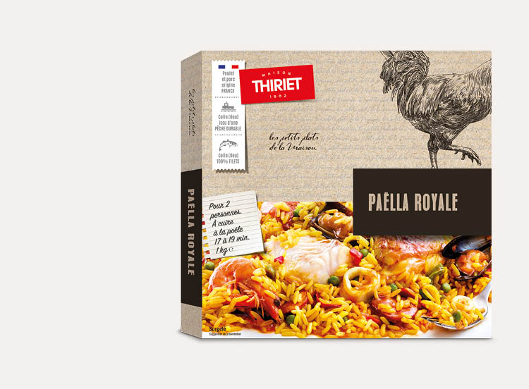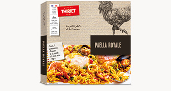 Eau, riz précuit 23,2% (riz, eau), viande de poulet cuite en bouillon 21,8% (haut de cuisse de poulet (origine France), bouillon (eau, sel, concentré de tomate, huile de tournesol, curcuma, jus d'oignon concentré)), filet de colin (lieu) (poisson) 5%, moule du Pacifique (mollusques) 4%, poivron rouge 2,8%, calmar (mollusques) 2%, huile de colza, base culinaire fumet de crabe vert (crabes verts (crustacés), huile de tournesol, eau, oignon blanc, sel), crevette nordique 1,5% (crevette nordique (crustacés), sel), oignon blanc, chorizo 1,2% (viande de porc (origine France), gras de porc, eau, piments, sel, dextrose, ail, origan, extrait d'épices, ferments), poivron vert 1,2%, petit pois 1%, moule du Pacifique décoquillée cuite (mollusques), sel, concentré de tomate, huile d'olive, ail, curcuma, épices