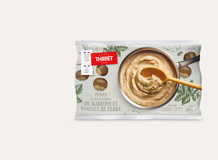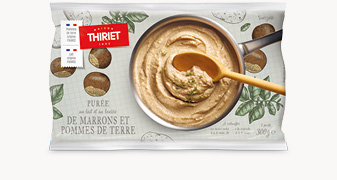 Une alliance gourmande de marrons et de pommes de terre (origine France), délicatement cuisinée avec du lait (origine France) et du beurre pour une texture fondante. Un accompagnement original, parfait avec une volaille ou une viande rôtie.