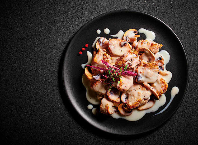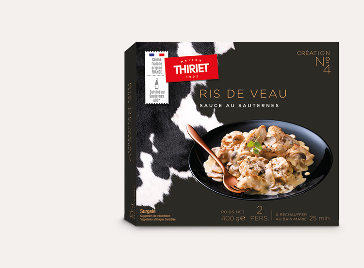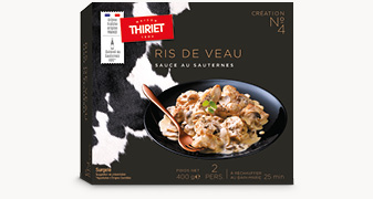 De tendres morceaux de ris de veau enrobés d’une sauce onctueuse à la crème fraîche (origine France) relevée de Sauternes AOC* et d'échalotes et accompagnés champignons de Paris émincés.