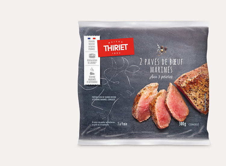 Thiriet a fait le choix pour ce pavé de bœuf aux poivres d'une maturation à 10 jours qui permet d'assurer à la viande toute sa tendreté et une qualité gustative unique.