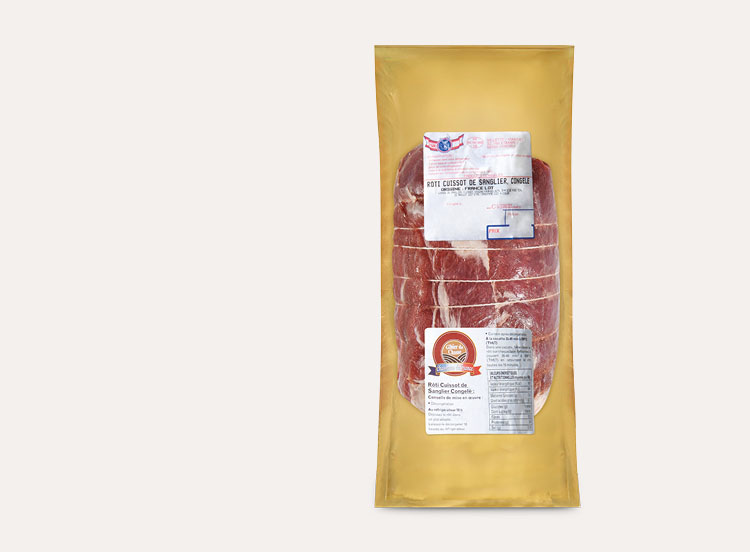 Ce rôti de sanglier, issu de chasse française, est découpé à la main, bardé puis ficelé à la main. Il est emballé sous-vide pour préserver toutes les qualités du produit.
