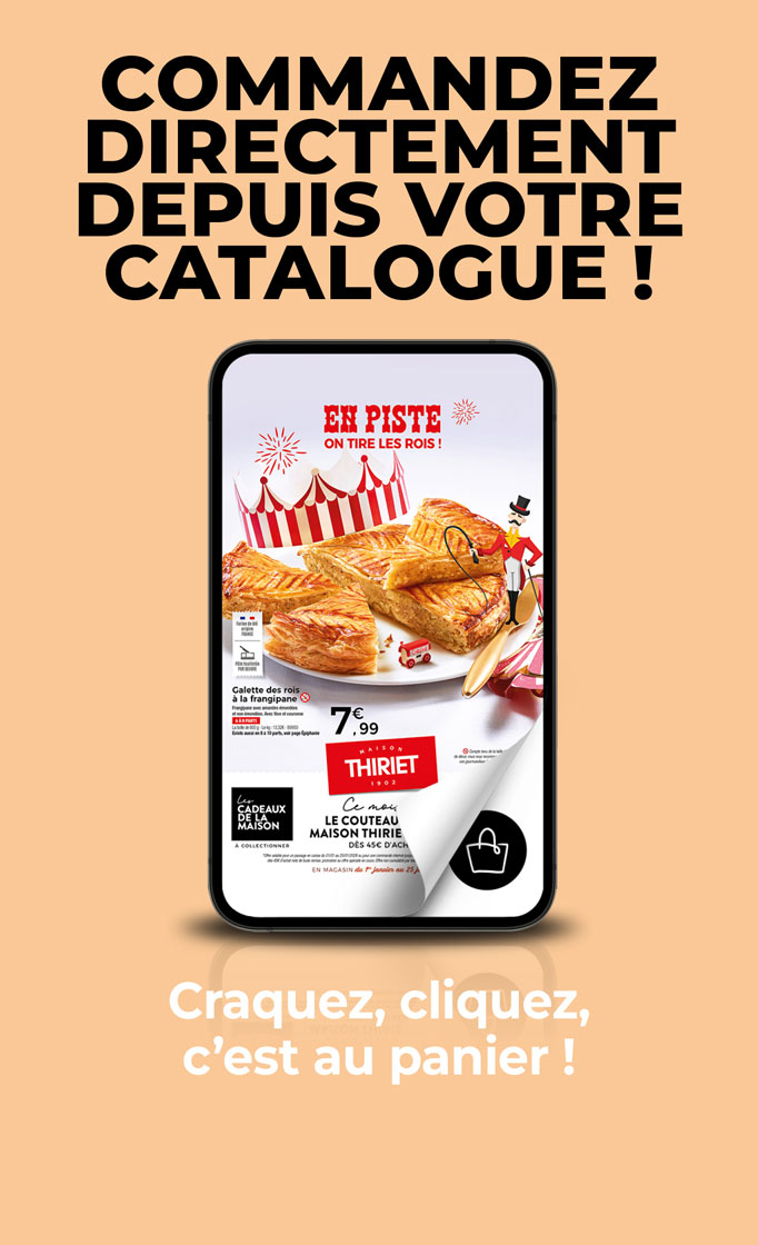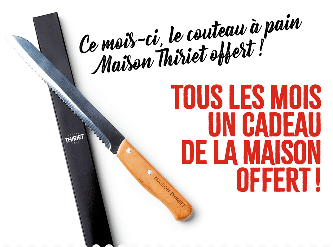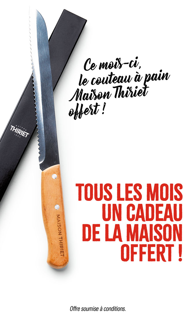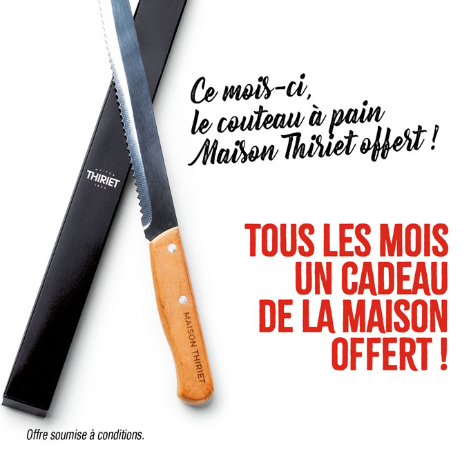 Le couteau à pain Maison Thiriet offert dès 45€ d’achat ! *Offre valable pour un passage en caisse du 01/01 au 25/01/26 ou pour une commande internet jusqu’au 24/01/26 minuit (24/01/26 midi pour l’Alsace/Moselle) dès 45€ d’achat nets de toute remise, promotion ou offre spéciale en cours. Offre non cumulable par tranche de 45€ d’achat. Dans la limite des stocks disponibles, en cas d’indisponibilité, une substitution vous sera proposée.